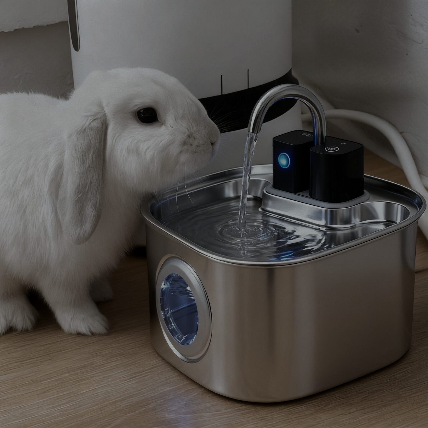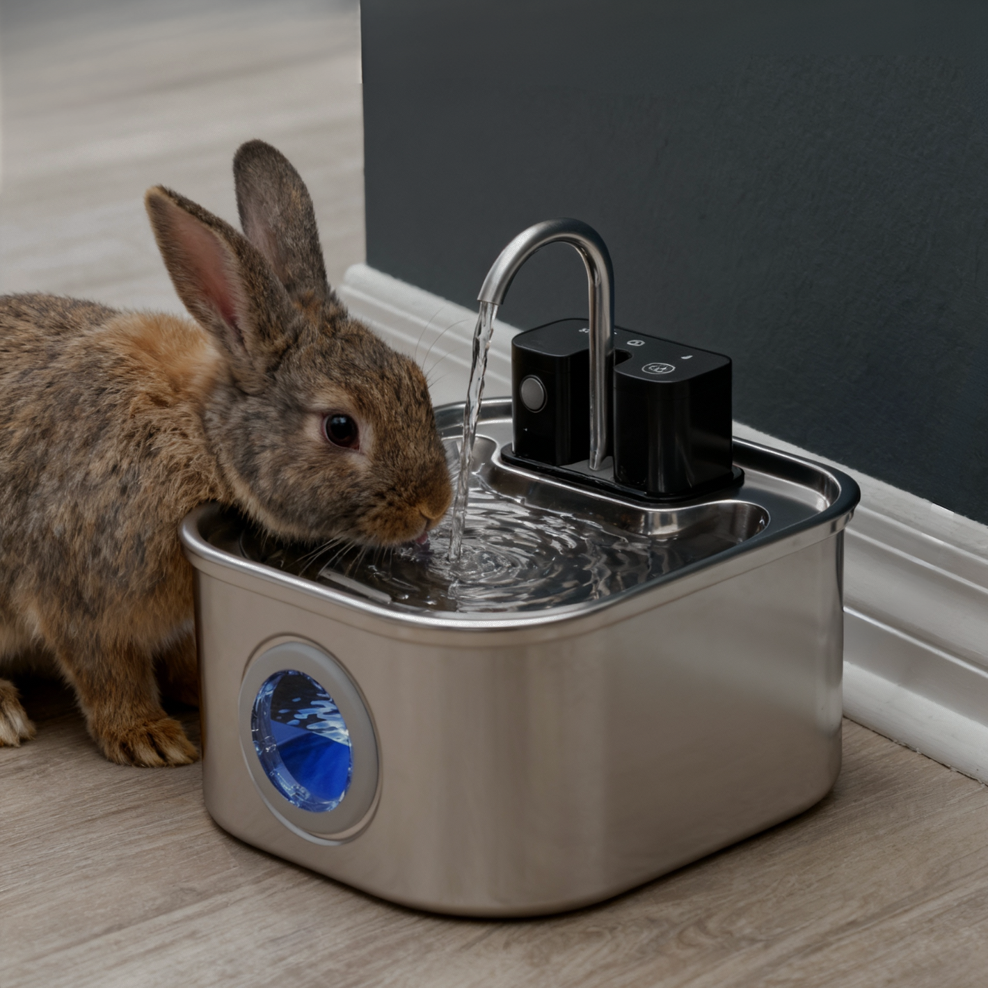 No. In 2+ years of vet recommendations, this rarely occurs. Rabbits instinctively recognize flowing water as a drinking source and treat it with the same respect their ancestors showed natural streams.